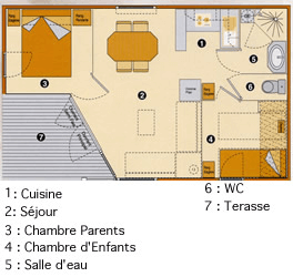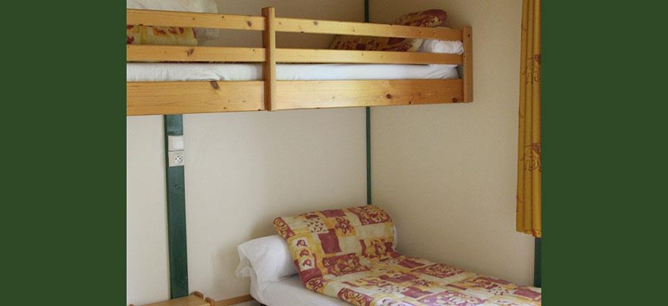 Les chalets 4/5 personnes sont tous équipés d'une chambre avec un lit double (140 cm), d'une chambre avec trois lits 1 personne (90 cm) dont un superposé, d'un coin cuisine équipée avec séjour 1 couchage, d'une salle d'eau avec douche et lavabo et d'un WC séparé, d'une terrasse couverte et ombragée de 6 m² avec salon de jardin.