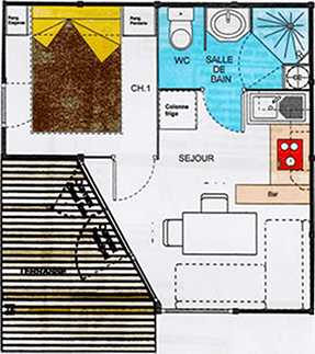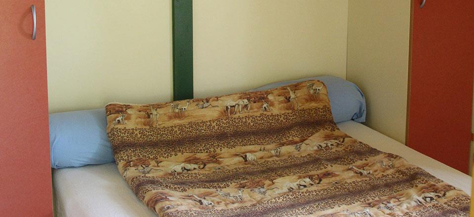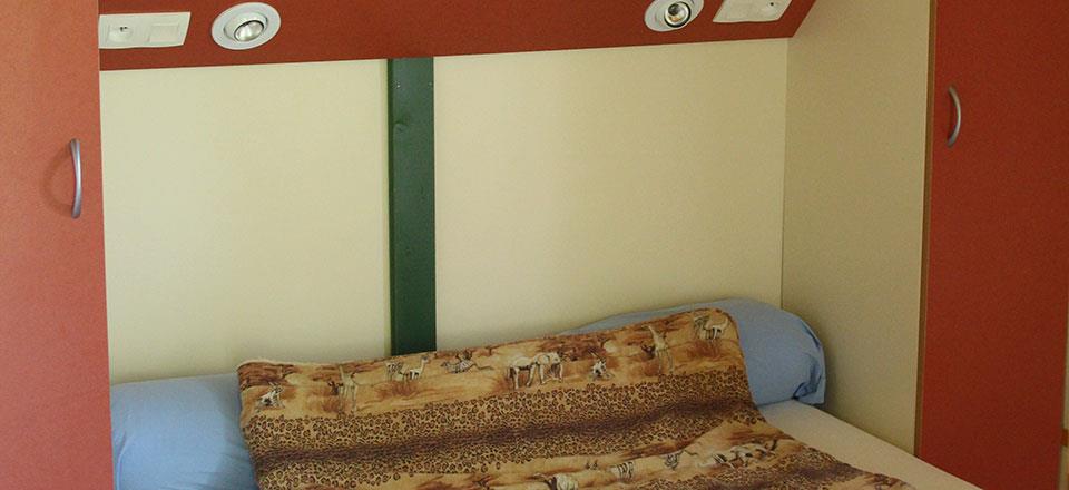 Le chalet PMR est équipé d'une grande chambre avec un lit double surélevé (140 cm), 1 chambre avec trois lits 1 personne (90 cm) dont un superposé, coin cuisine équipée, salle d'eau avec douche au sol, lavabo et WC surélevé. Grande terrasse couverte de 8 m² avec salon de jardin.